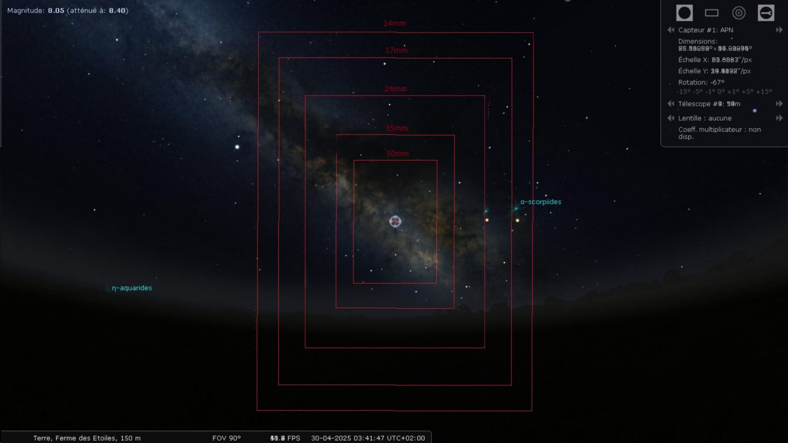 Un exemple via Stellarium de cadrage en fonction de la focale utilisée, sur capteur APS-C