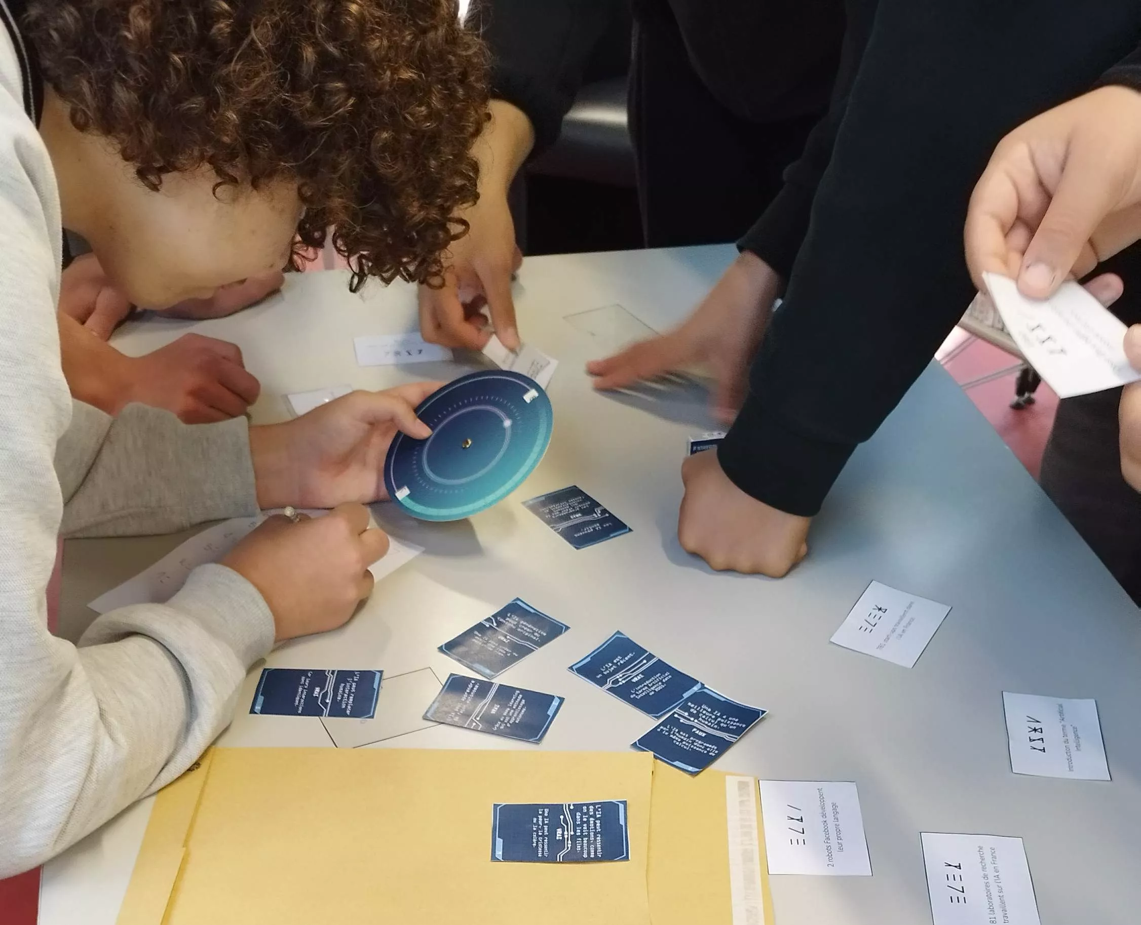 Une fois le squelette et les organes établis et préparés, les phases de tests ont été réalisées avec différents publics (scolaires, familles, groupe d’adolescents…) et dans différents lieux. Cette phase est indispensable afin de vérifier la cohérence des contenus et la pertinence du dispositif. L’étape suivante, et pas des moindres, a consisté à mettre en forme les supports et le guide du maître du jeu. L’harmonisation graphique, la mise en page et la préparation des documents étaient essentielles pour obtenir un dispositif fonctionnel, efficace et agréable à prendre en main.