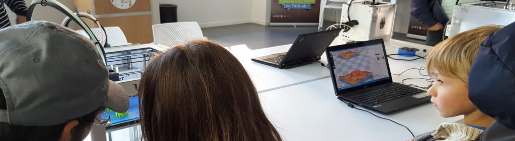 Sur les photos : un atelier à la découpe laser pour créer un objet simple à graver et découper. Un atelier à l’imprimante 3D pour créer et imprimer un objet en 3D. Un atelier à la découpe vinyle pour créer son propre autocollant.