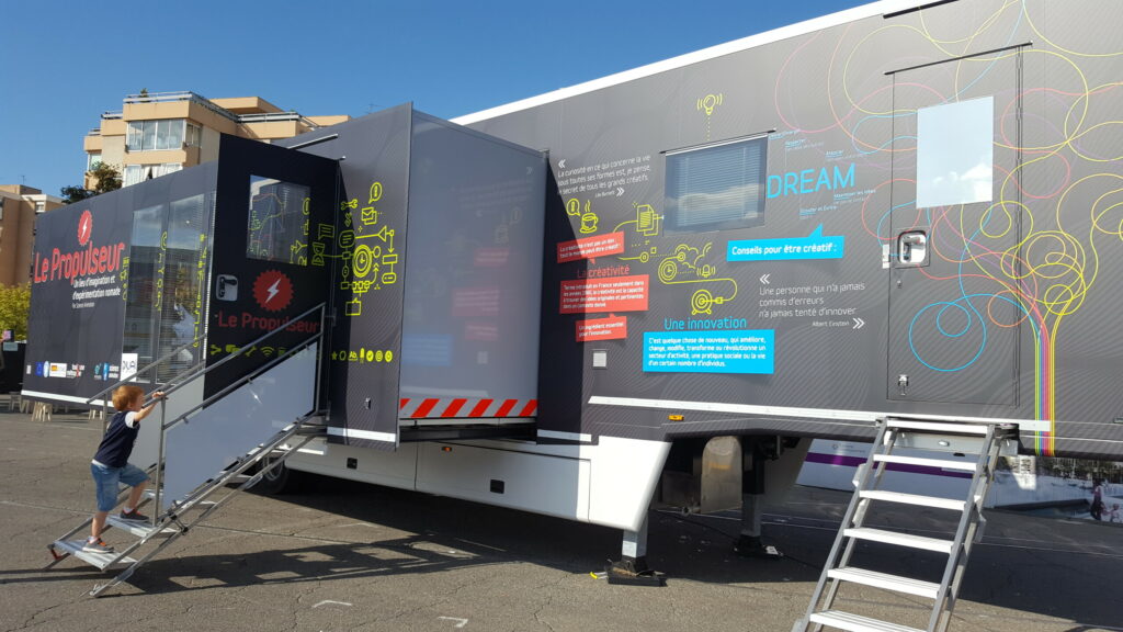 L’idée est de reprendre les codes des camions ambulants qui viennent dans nos villages pour vendre des produits du quotidien à l’mage des camionnettes d’épiciers, ou des semi-remorques spécialisées dans les produits de bricolage. Mais, en ajoutant à cela un univers futuriste qui donne envie de s’approcher et de rentrer. Un univers qui évoque quelque chose de différent et à la fois pas trop éloigné du quotidien de notre public qui sera tout autant urbain, semi-urbain que rural.