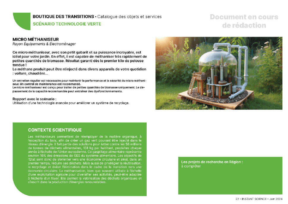 Après avoir obtenu des objets de plus en plus précis, que la forme s’applique à la fonction (et que la fonction s’est aussi, un petit peu, adaptée à la forme) alors nous avons pu élaborer un véritable catalogue de tous nos objets classés par scénario. Un catalogue où l’on retrouve, pour chaque objet, une description commerciale, un slogan, l’intérêt de l’objet dans le contexte du scénario, un contexte scientifique (ne perdons pas le Nord)…
